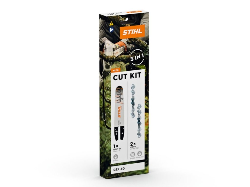 STIHL Cut Kit 18 je praktická sada vodicí lišty a pilových řetězů pro akumulátorovou vyvětvovací pilu GTA 40, která umožňuje rychlou výměnu řezné soupravy a přesnou práci při údržbě zahrady i stromů.