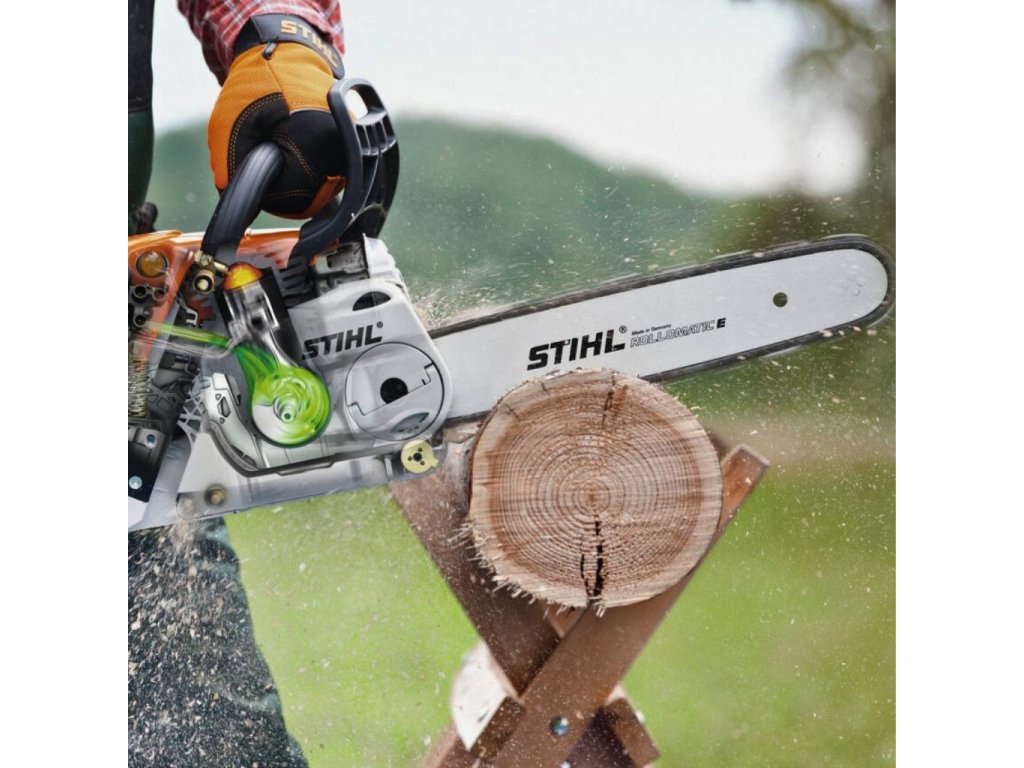 Systém STIHL Ematic zajišťuje optimální dodávku oleje přes vodicí lištu a řetěz a umožňuje snížení spotřeby oleje až o 50 %. Při prašném prostředí nebo při použití dlouhých lišt lze rychle zvýšit množství maziva.