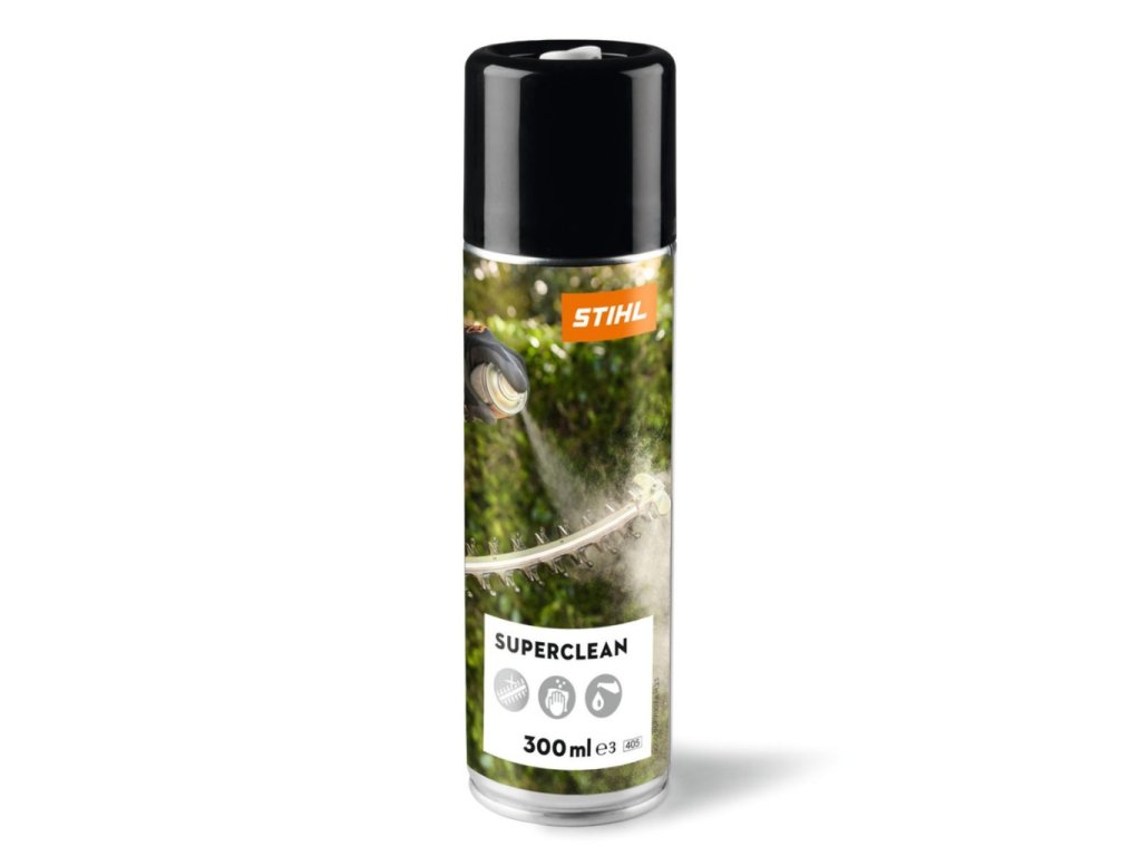 Superclean je čisticí a mazací sprej STIHL, který odstraňuje pryskyřici, rez i nečistoty a zároveň chrání nástroje před korozí.